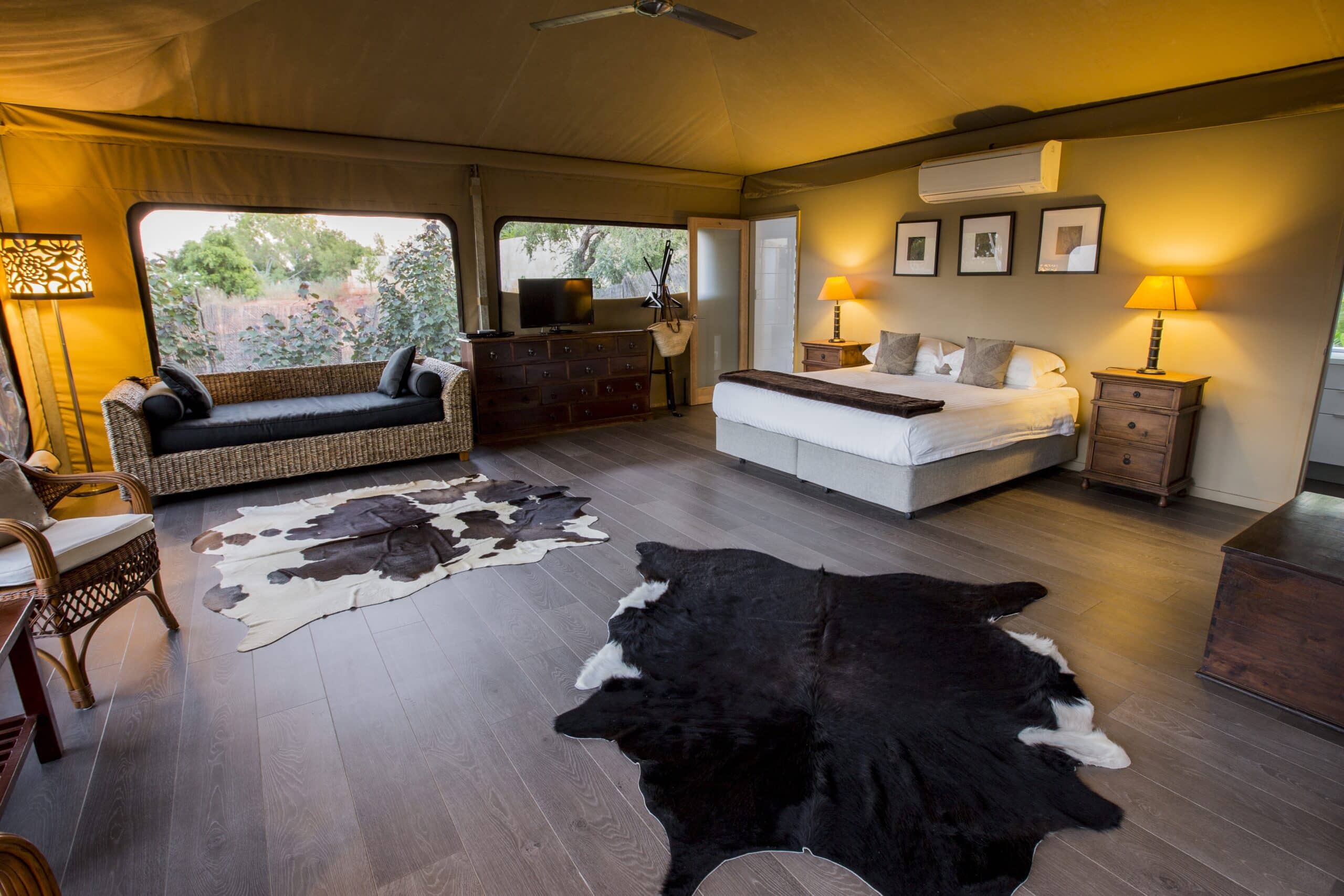 Conveniently located where the red earth meets the sands, these Eco Tents with rainforest concept awaits just minutes from Cable Beach. Experience luxury glamping with timber walkways inside this spacious tent, furnished with king-sized bed, air conditioning, kitchenette, and outdoor rain shower. Roll up your mesh windows to enjoy natural airflow and breath-taking surrounding view.